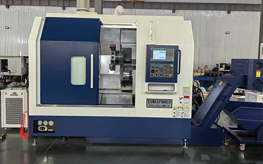 Серия токарно-фрезерных станков+MS имеет стандартную конструкцию станины из серого чугуна HT300 с наклоном 30°, c линейными направляющими. Ось Y интерполируется из двух осей X через дополнительную наклонную каретку на 30°. В стандартную комплектацию входят прецизионные электрошпиндели EUMASPINNER как для главного шпинделя, так и для контршпинделя, оснащенные системой водяного охлаждения, биение шпинделя (nose runout) не превышает 0,001 мм, конусов от A2-5 до A2-8. Диапазон рабочих диаметров от 220 мм до 400 мм, длина от 400 мм до 850 мм. Быстросменная револьверная головка может быть типа BMT или VDI что позволяет эффективно выполнять как токарные, так и фрезерные операции. Для достижения сверхвысокой точности в производстве предлагается использование ШВП класса C0/C1. Дополнительно возможна установка системы поддержания постоянной температуры корпуса станка, что позволяет стабилизировать процесс обработки и минимизировать температурные деформации.